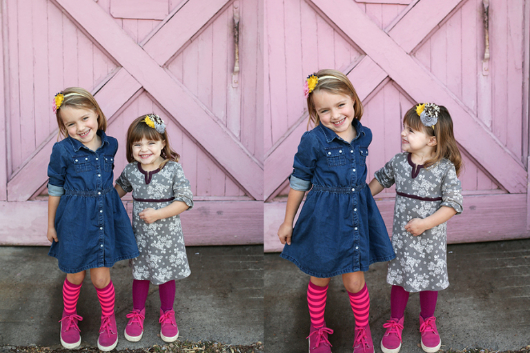 The alternative location, the light streaming through that rickety old fence, the scrunchy nose smiles from a pair of adorable sisters.